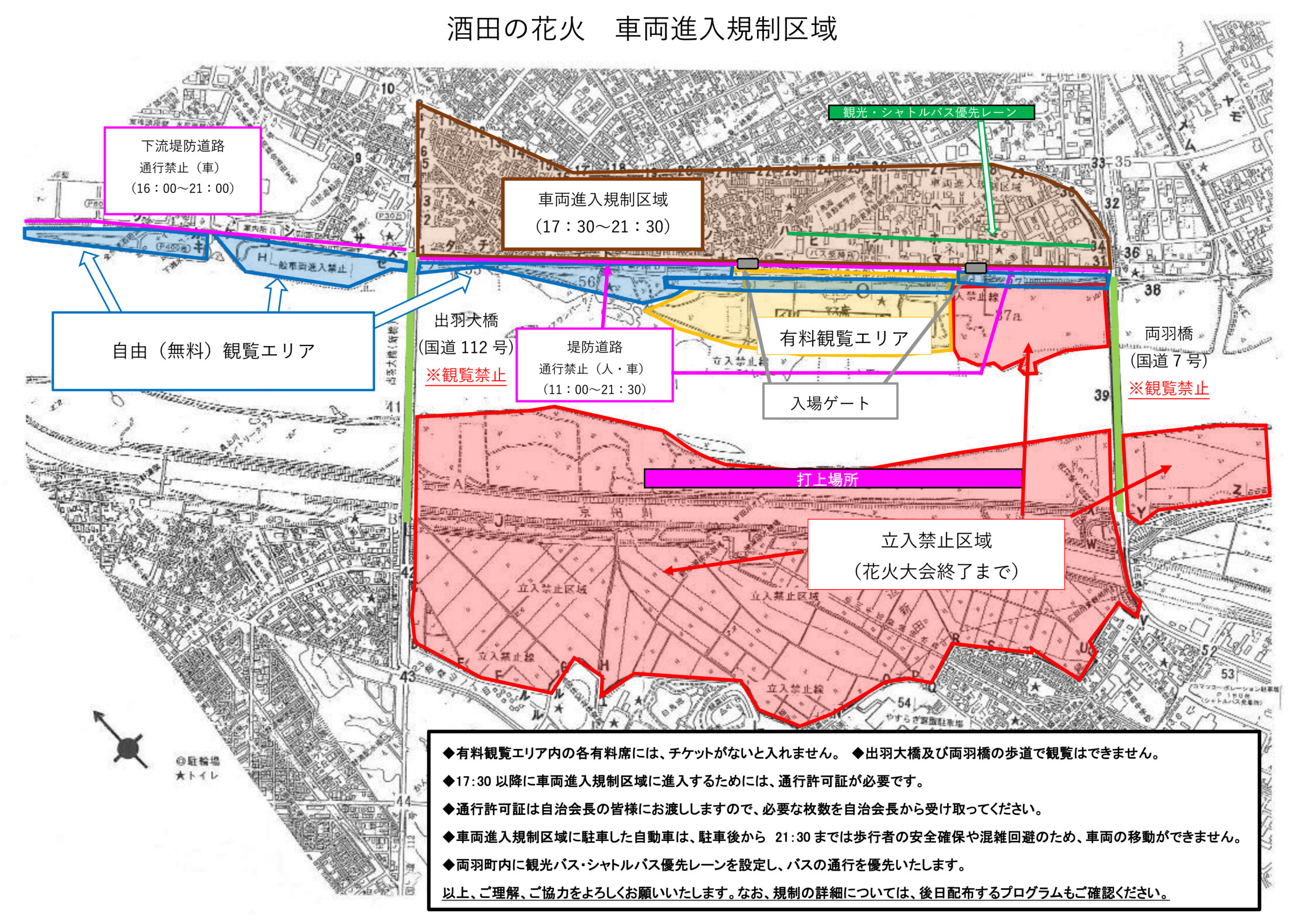 当日は観覧会場、打ち上げ場所付近において交通規制がかかります。